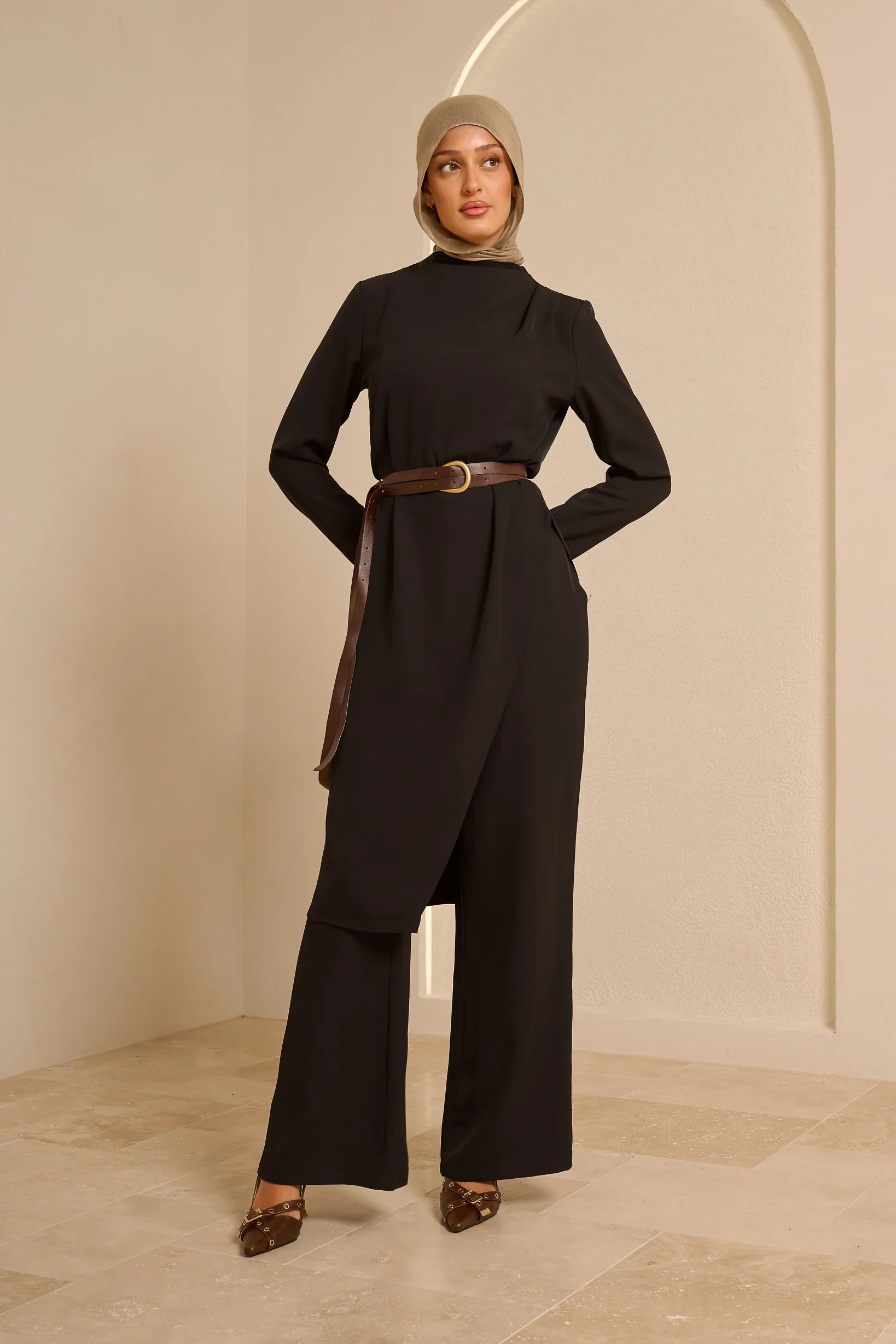 This two-piece redefines modest fashion Australia, featuring a wrap-front tunic with an architectural hem paired with coordinating wide-leg trousers.
