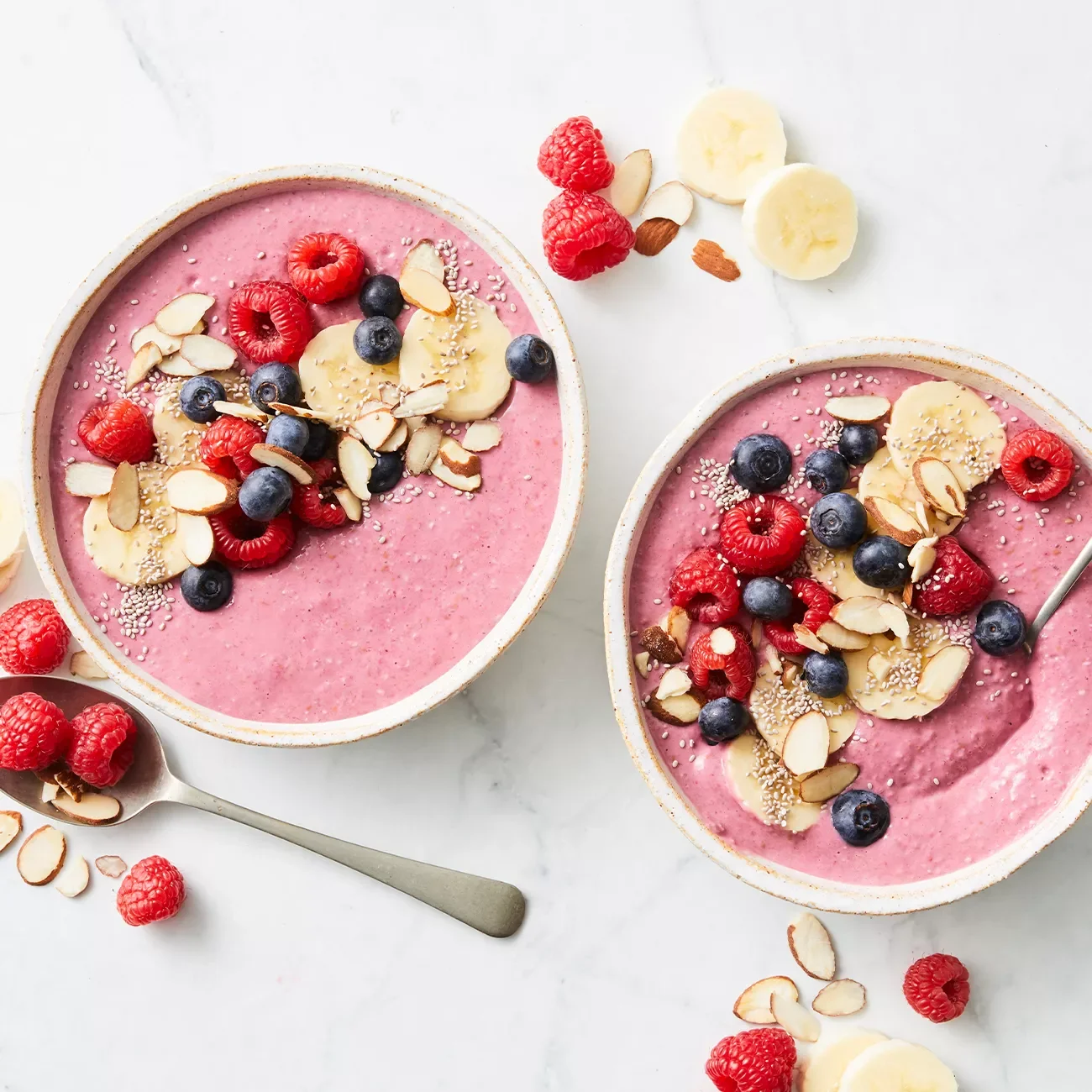 Simply place oats, milk, frozen raspberries, protein powder and half a banana in a blender. Blitz for 30 seconds or until smooth, then pour into bowls. Top with the remaining banana, fresh berries, almonds and chia seeds.