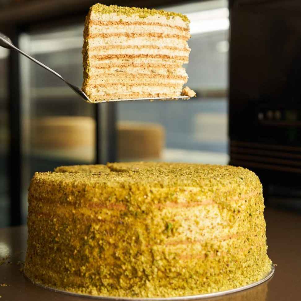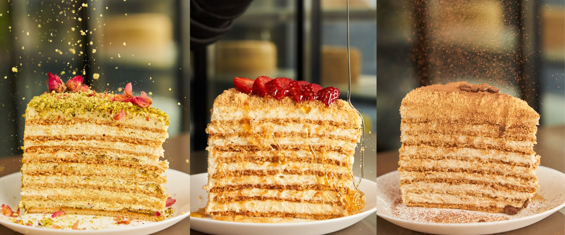 Honey Cakes (also known as Medovik) are made with delicate layers of honey-infused sponge, stacked with smooth cream in between each layer.